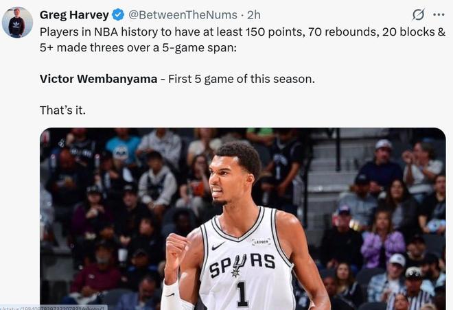 开季至今5场比赛,文班亚马已经拿下151分24盖帽,成为NBA历史上首位在开季前五场能够拿到至少150分20次盖帽的球员。